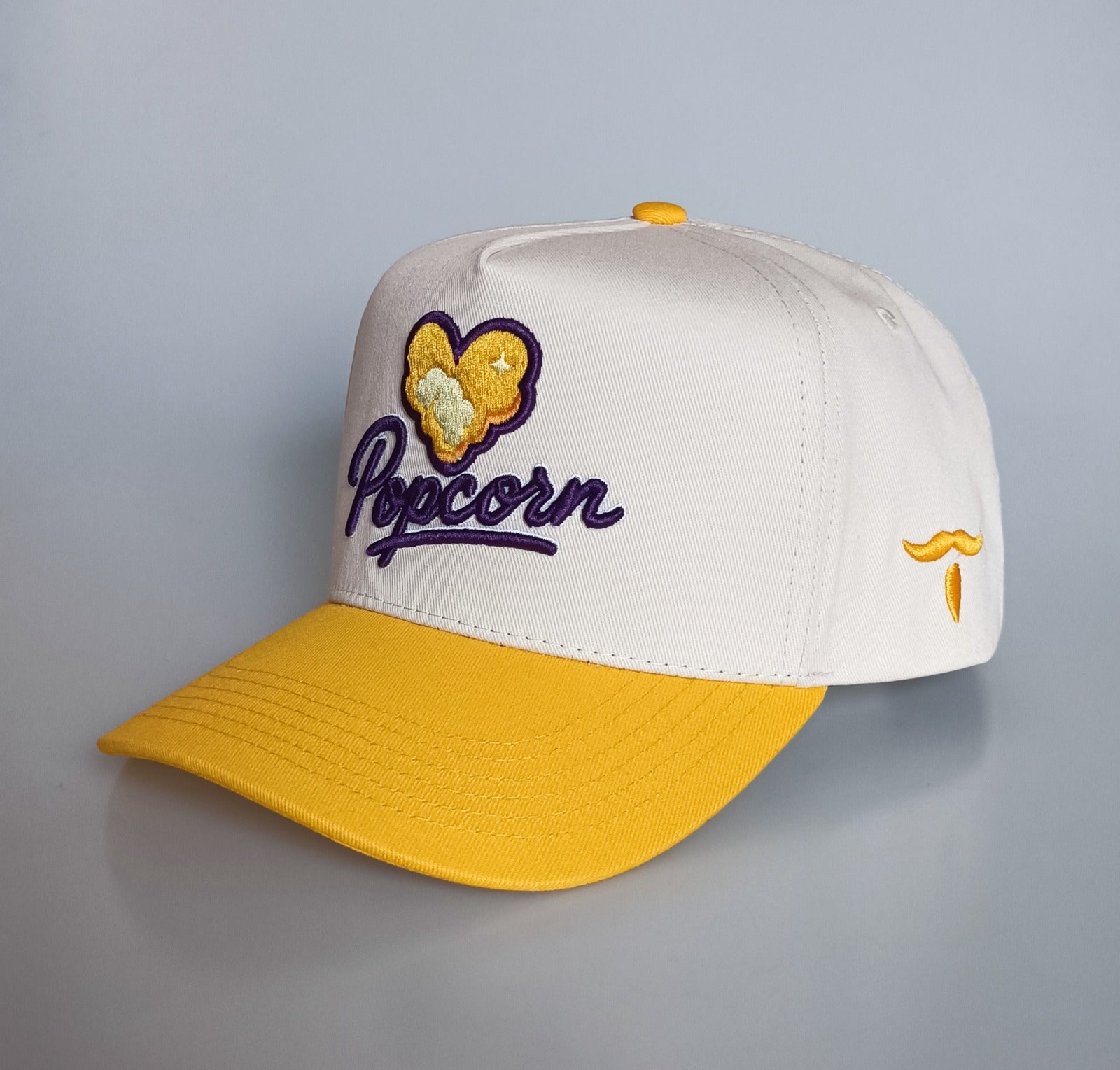 This cap features 'Popcorn' embroidered on the front and Kernies signature mustache on the left side.